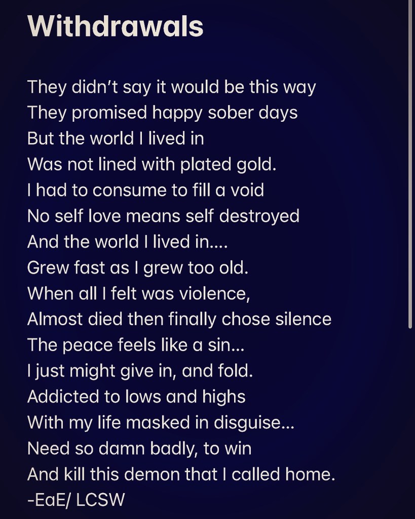 This is about drug and abusive relationship withdrawal. How even though the sobriety of it is better for us, we feel extremely unsteady with our newfound peace.