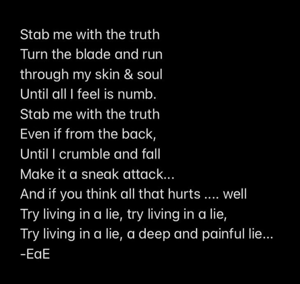 I wrote this in regard to people that were close to me, that thought it was a better idea to lie to me and allow me to live in “blissful ignorance” vs tell me the actual truth. Be honest with your friends and partners, even if it hurts.