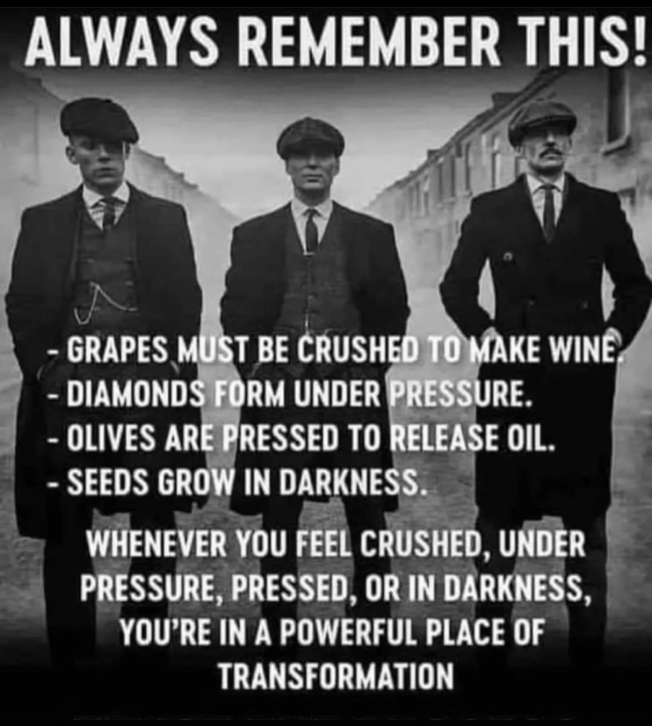 This is a harmful way of conditioning people to be a pushover or a doormat. Should we really say “ok” to everything? Okay to physical or mental abuse? Okay to being used for our money? Okay to compromising on our boundaries or Non-negotiables? Okay to workplace harassment or maltreatment? Sometimes, moving on is impossible without assertive confrontation and change. Forget our past? Then how do we learn from our mistakes? Memory has a purpose, perhaps we shouldn’t let it go to waste. Always be positive? What if we’re grieving? Should we force a smile through a trauma or a funeral? Again, this concept of don’t think or feel and to “keep it moving” makes no sense. We forget that pausing and reflecting has a purpose. This all depends on what the “bad yesterday” was. It could be a lesson. If we don’t learn from those lessons we are doomed to repeat more bad days. None of these tips are bad. But the advice in totality is bad. Humans are creatures of habit and conditioning. If any person tried to make all these changes at once, they’re bound to spiral into a depression binge after. Goals start small and are better off realistic, feasible and most importantly, sustainable over a long period of time. What if the negative thought is something that needs to be worked through? Like “I’m so miserable… I need to change”. Forcing positive thoughts will not lead you to creating the objectives and goals that are necessary for a change that can help you in the long run. Hard times with the opportunity to find ways out can lead to increased resilience. But traumatic times, with no support and a sense of helplessness will cause PTSD. Some trauma does not lead to beautiful transformation unfortunately, sometimes it leads to a chronic mental health condition. Much like the men from this show in the meme! Peaky Blinders. Or maybe they just don’t want their heart to be ripped out and crushed into a million pieces. Aren’t we supposed to not get with the same type of person over and over again? Also, a genuine person shouldn’t be worried about being held accountable, especially if their intentions in a relationship are pure.