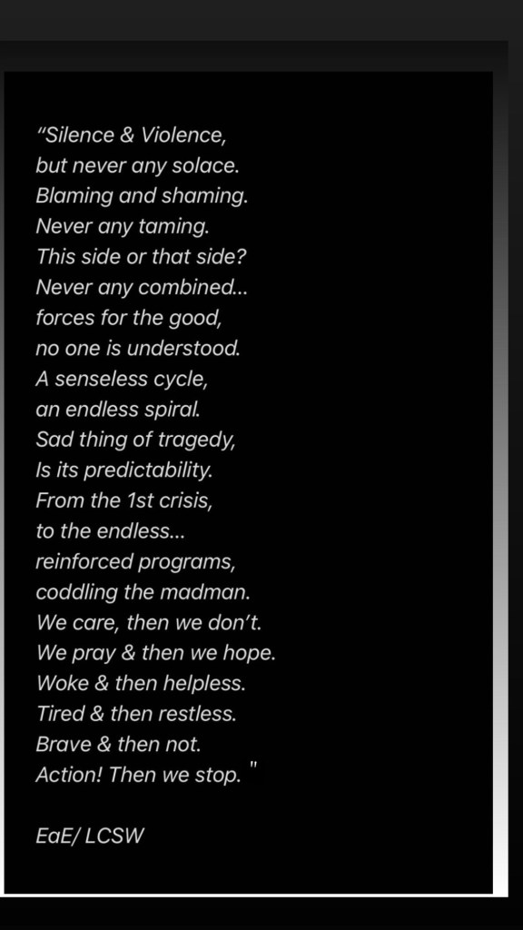 This Poem was definitely about PTSD symptoms. About how our intrusive memories will keep coming back to us, disrupting our sleep and disrupting our daily lives. There’s also a heavy aspect of ‘victim blaming’ that comes along with suffering from such a chronic condition, which I also portray in the second part of the poem. And, if PTSD sufferers happen to get retraumatized, many people would assume we are doing it to ourselves on purpose. PTSD is a lifelong condition that does not go away. We can learn to manage it better, but the side effects will absolutely change our brain and our personality. It’s often known as a condition that prevents ‘normalcy’ in the public eye, which furthermore causes the sufferer to isolate. I started writing this in my head while I was literally on a roller coaster in Las Vegas at the NY, NY hotel. I was in a stage of my life where I felt like I was evolving. As I road the roller coaster I reminded myself that there was nothing to be afraid of, I already committed to this. And, I knew what already was ahead of me; a scary tall drop. What is the sense in closing my eyes out of fear if I already know what is going to happen anyways? I decided that this was how I wanted to approach my life; with less fear. Also the poem implies had I not gone on the roller coaster, I would regret it. Just like in life, if we avoid something out of fear, we often regret it later. I wrote this poem about War and school shootings mostly. When catastrophe happens I tend to block it out in the moment. Why? Because I have a pure hatred toward most humans in the immediate aftermath; the blame game. We don’t find solutions, we fight. We don’t work on prevention, we sweep it under the rug and pretend it won’t happen again. We don’t fix things, we just pretend we will with empty words. And then, the cycle repeats itself, over and over and over again. I’m essentially pointing out that all we do is run in circles. This was my best poem regarding how it feels to be subjected to a romantic relationship with a Narcissist. Where at times it feels like you are in the greatest high you have ever experienced, but how shortly after you could be brought down so low that you are living in terror and utter confusion. Confusion especially due to being gaslighted into believing ‘everything is your fault’; a narcissist is allergic to accountability. Narcissists work in very crafty ways to keep their victims hanging on with hope, while simultaneously destroying their self esteem. The end result is that the victim will be used, abused and thrown away. Inevitably, we will have rage because we tried our best and suffered through so MUCH, only to ‘come up short.’Through aging and more mental illness, things just tend to get harder. Ongoing trauma and daily symptoms cause most humans wear and tear. It get’s to a point where we understand the warnings of our elders before us; youth is special and we do not know how to treasure it until it’s already gone. We end up missing our innocence because it was a life where we were free of pain. As we age we try to cling to hope, and other’s try to help us restore hope, but sometimes we are a ‘lost cause’ because we have just suffered too many mental injuries. The innocent mind is gone for good.This poem represents the most unhealthy levels of Codependency that people can experience. Taking in a person that’s so toxic and becoming more and more sick because you insist on staying in something toxic. There are people that are so ill that they abuse others, and there are also people that are so ill that they cannot help but ‘welcome abuse’ into their lives unconsciously or subconsciously. It’s the reality of how we could need someone so much that it makes us sick, and getting rid of them will somehow feel like ‘a loss’, even if it’s really good for us. A traumatized toxic brain grew up with love and pain being ‘one in the same’ thing. This one I believe is self explanatory. It’s describing the culture of ‘toxic positivity’ that surrounds people that are hurting, mentally ill. The message is that we know how to ‘pretend to be positive’, but it does not mean it’s how we will ever feel inside. Sometimes raw honesty is better, even if ‘negative’, because at least it’s truthful. And a message of, if you don’t want to be around me during my times of pain, instead of the fake positive messages, you could just leave and go live off in rainbow land by yourself. Don’t try to put a Band aid on a Stab wound. I wrote this poem all the way back in High School and it’s one of the few that I did not feel a need to edit. It’s the message of ‘no matter how much humans may lose’, many of them keep hanging on until the end. Why? My High school brain decided that maybe it was simply ‘desire’. My desire keep’s me going, even on the boring or miserably hard days. I recognize that I write a lot of depressing stuff, so I wanted to end this blog with a poem that leaves off on a ‘positive note’ anyways.